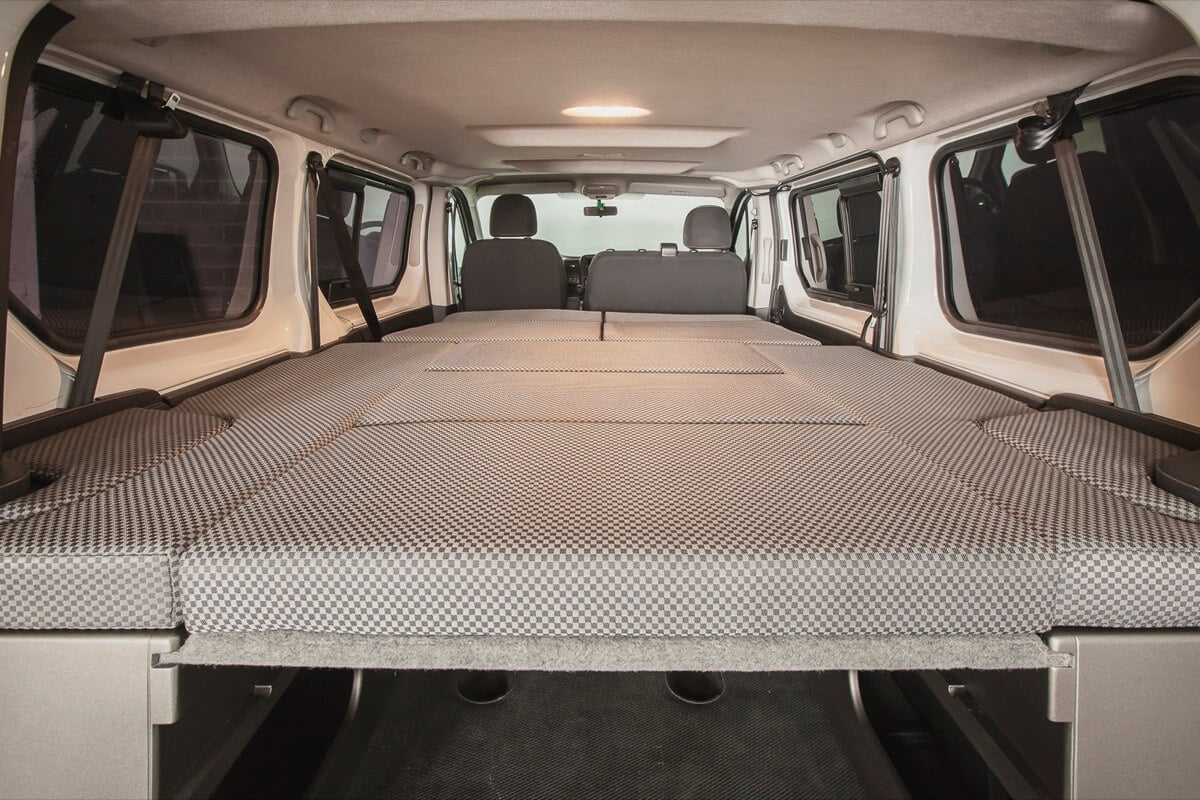 Este opcional te permite tanto mantener las plazas traseras como poder quitarlas en un momento dado y así disponer de más espacio en la zona central del vehículo. También puedes añadir al pie de cama otro opcional que te permite formar una mesa.